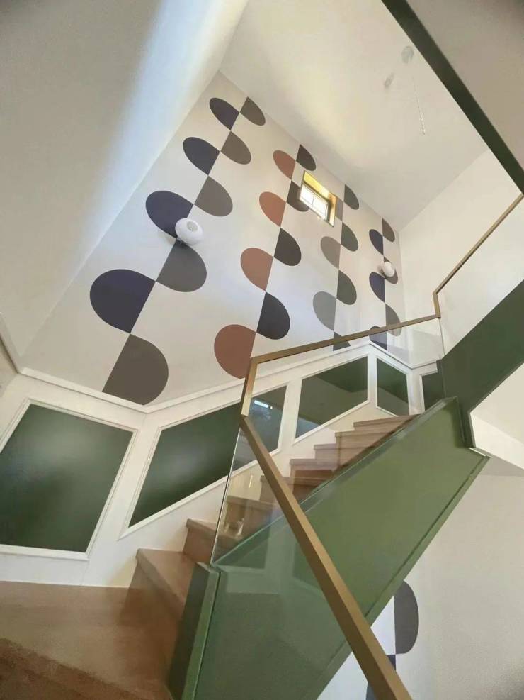 楼梯用的是原木材质和面状的绿色墙面给人舒适自然的气息。
