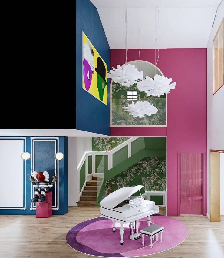 挑空大量的留白,点缀几花朵形状的吊灯让空间丰富多彩。