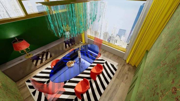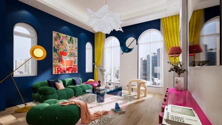 客厅鲜艳明快的色块与大胆的撞色配色,具有很强的趣味性,特别注重运用几何元素和提倡图案装饰,追求装饰艺术与设计功能的和谐一致,它宣扬了一种敢于想象和推翻、打破常规与原则、改变历史潮流、乐观又无所畏惧的态度。