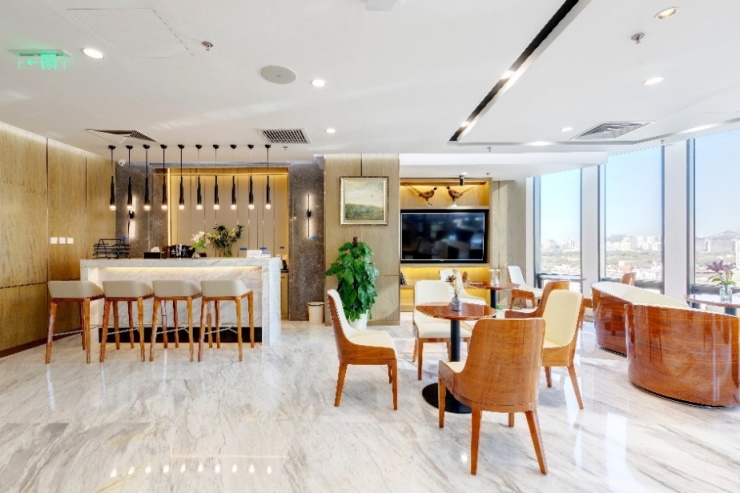 世鳌国际SK大厦服务办公中心,包括5层和16层,近5000平米,98间房间,较小独立办公间2人间,4间5-12人会议室,3个咖啡休闲区,可同时容纳近1000人办公。整体装修风格延续了世鳌国际一贯的高端商务风,灰色影木搭配霸王花石材,定制地毯搭配香槟金布艺硬包,时刻演绎国际商务音阶;暖色灯光使空间更富韵律和动感。同时配置智能办公设施设备,人体工程学环保办公家具,自助预订会议室,云端访问办公设施,手机智能监控等。
