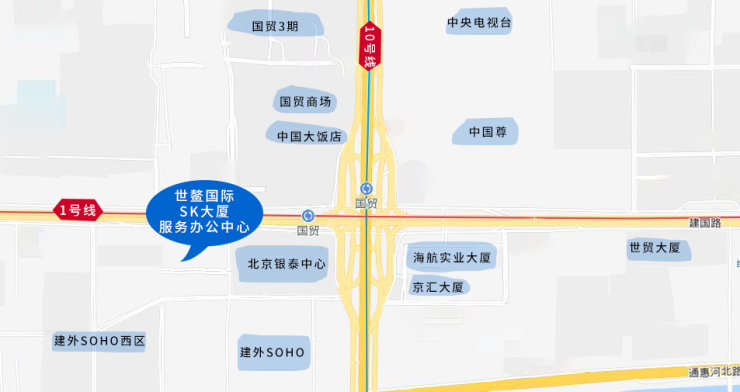 据了解,SK大厦服务办公中心位于北京国贸CBD核心区,位于长安街沿线,CBD中轴路、东三环、通惠河北路路网格局的中心,周边银泰中心、国贸中心、建外SOHO、招商局大厦等多座甲级楼盘遍布周围,还有中国大饭店、国贸饭店、柏悦饭店等五星级酒店。