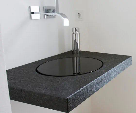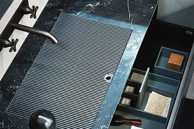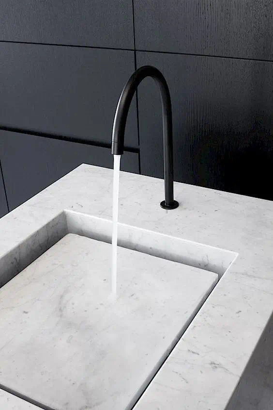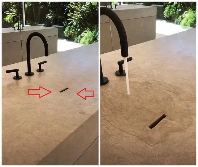 乍一看台面上空无一物,连洗手池都没有,仅仅有水龙头,或者再多加一面镜子,走近就能够发现,水龙头的下方是有凹槽的,其实这一圈的拉槽也就是代替了洗手池的排水功能,从而有效保持台面上的清爽干净。