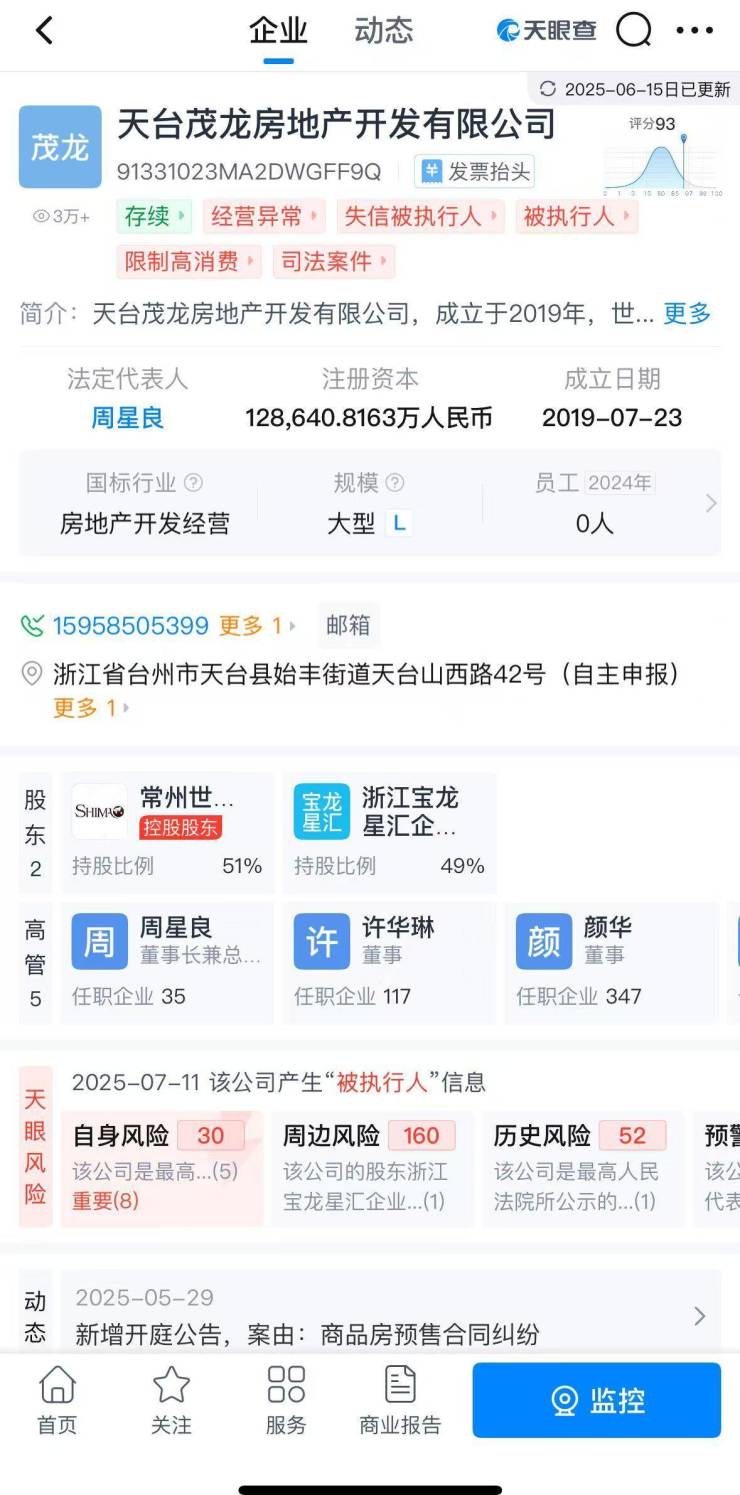 天眼查App显示,天台茂龙房地产开发有限公司2023年7月1日因未依照规定的期限公示年度报告,被天台县行政审批局列入经营异常名录。此外,欠税公告显示,茂龙地产目前欠税主要为土地增值税和企业所得税。