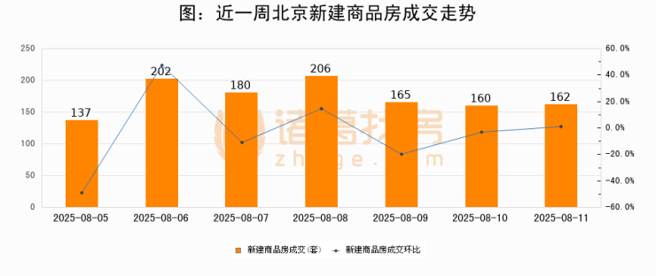 根据北京市住房和城乡建设委员会数据显示,2025年08月11日北京新建商品房成交162套,较昨日增加2套,环比上涨1.2%。近一周北京新建商品房日均成交174套。08月11日单日成交162套,低于近一周平均水平6.9%。
