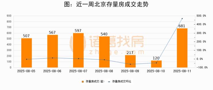 从存量房来看,2025年08月11日北京存量房单日成交681套,比昨日增加561套,环比上涨467.5%。从近一周存量房成交来看,北京存量房日均成交套数为461套,08月11日单日成交681套,高于近一周平均水平47.7%。