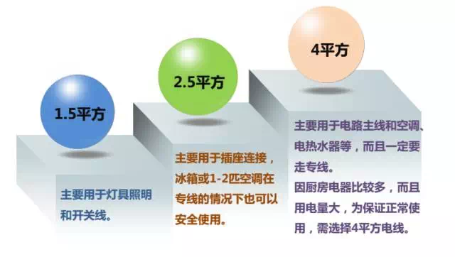 家装电线主要有三种规格:1.5平方、2.5平方 和 4平方,另外还有6平方和10平方,但主要用于迚户主干线,在家装中几乎不用或用量很少。