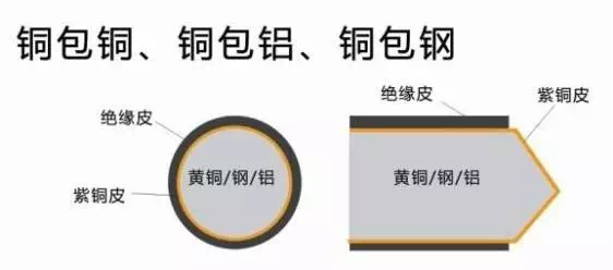 国标电线要求使用99.9%的无氧裸铜(紫铜),但一些不良厂家为了降低成本,往往使用黄铜、钢或铝,然后裹上一层紫铜以蒙蔽消费者(如下图所示)。