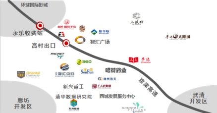 京津智汇广场周边汇聚一流高新科技园区,行业巨头争相入驻,包括京津智汇中心、亚洲排名前列大电信运营商太平洋电信、奇虎360、搜房网总部、清华大数据研究院、新兴重工等数百家知名企业。除此之外,该项目接驳北京的区域优势使项目在区域积极融入京津冀协同发展战略当中,成为天津、北京资源转移首当其冲的载体平台。与此同时,京津智汇广场所在区域坐落于武清北的京津产业新城之中,同享高级开发区与天津自贸区的优惠政策。