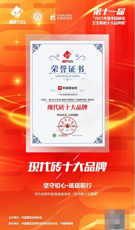 2021年7月10日,由中国建筑装饰协会、中国陶瓷网举办的第十一届“2021年中国建筑卫生陶瓷十大品牌榜”于线上正式放榜。