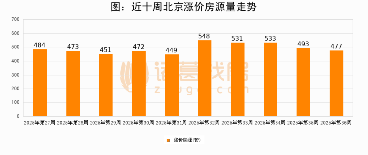 从调价房源来看,第36周北京涨价房源477套,较上周下降3.2%。与此同时,36周涨价房源占比回落0.77个百分点,业主信心小幅波动,购房者可则需入市。