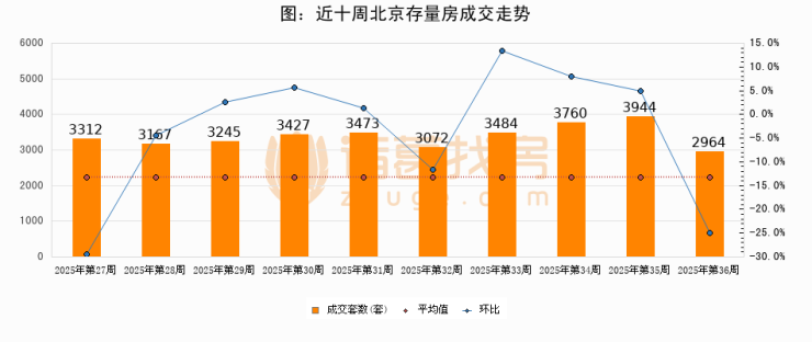 存量房方面,第36周北京存量房成交2964套,较上周减少980套,环比下降24.9%。从近十周成交走势来看,周均成交套数为3384套,本周低于平均水平12.4%。