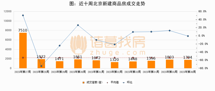 进入2025年第36周(09月01日-09月07日),北京新建商品房成交1794套,较上周减少9套,环比下降0.5%。从近十周成交来看,周均成交套数为2240套,本周成交1794套,低于近十周平均成交量19.9%。