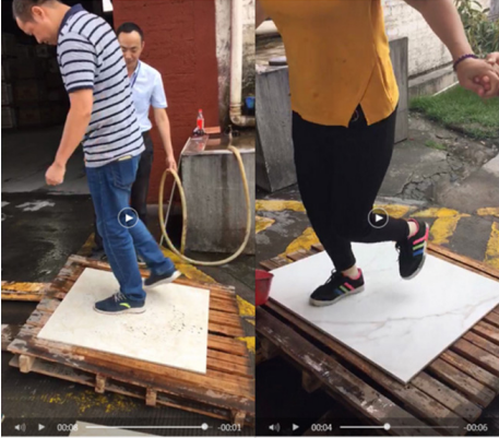 箭牌止滑砖与传统的防滑砖不同,其有着“遇水更安全”的特点。将该款瓷砖的砖面倾斜度调整至越30°,测试人员分别在砖面遇清水和泡沫水两种情况下,穿着高跟鞋、拖鞋和光脚在砖面上行走,以此测试瓷砖的防滑性能。最终结果是,无论在哪种情况下,测试人员行走时脚部并没有出现任何打滑现象,状态稳定自如。