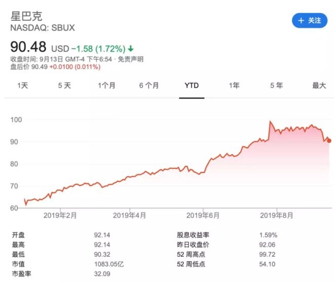 2019年以来,星巴克的股价也在不断提升。1月不过60美元左右,而到了9月,星巴克股价达到了90美元上下。