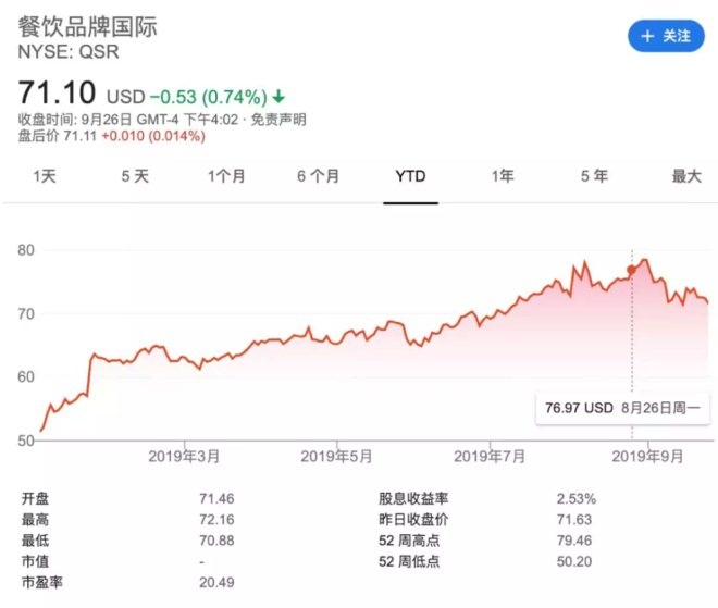 从2019年年初的50美元出头到2019年9月的接近80美元,数字化转型让RBI同样获得了可观的股价增长。