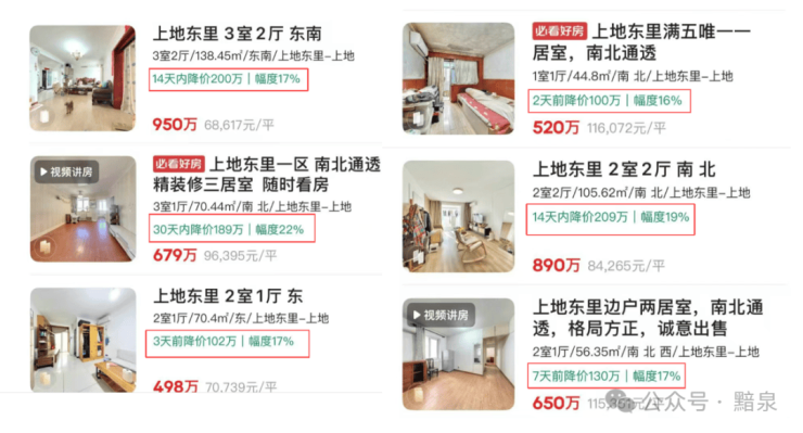这不是孤例。如果你最近打开贝壳找房,搜索“上地东里”——这个海淀学区房中的“战斗机”,扑面而来的是一种末日狂奔般的降价氛围: