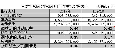 在短期偿债能力方面,三盛控股2017年和2018上半年的速动比率在0.47左右,无明显波动,但流动资产偿还流动负债的能力较差。