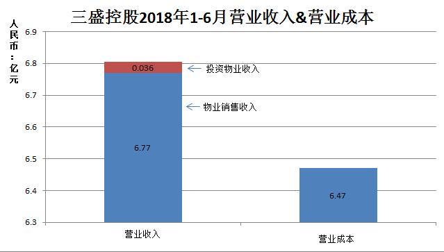 根据较新财报显示,截至2018年6月30日,三盛控股收入总额约为6.8亿元,收入总额中有99.5%来自物业销售约为6.77亿元,投资物业租金收入约人民币0.036亿元;销售成本为6.47亿元,毛利为0.34亿元,毛利率为4.95%。
