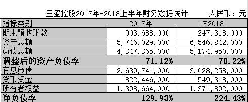 从三盛控股的杠杆结构来看,剔除了预付账款的资产负债率从2017年约71%上升到2018上半年的78%左右,接近行业3/4位数79.62%。