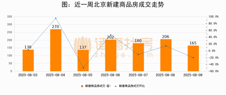 根据北京市住房和城乡建设委员会数据显示,2025年08月09日北京新建商品房成交165套,较昨日减少41套,环比下降19.9%。近一周北京新建商品房日均成交186套。08月09日单日成交165套,低于近一周平均水平11.3%。