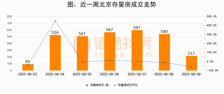 从存量房来看,2025年08月09日北京存量房单日成交217套,比昨日减少323套,环比下降59.8%。从近一周存量房成交来看,北京存量房日均成交套数为435套,08月09日单日成交217套,低于近一周平均水平50.1%。