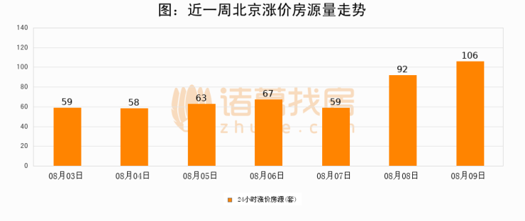 根据诸葛找房数据显示,北京24小时涨价房源量为106套,较08月08日增加14套,环比上涨15.2%。与此同时,涨价房源占比小幅扩大,业主信心有所提升。
