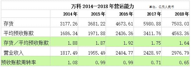 2017年,万科存货周转天数为1198天,2018年延长至1304.35天。这意味着,7503.03亿元存货周转一次需要3.6年,比2017年多了3.5个月。同时,万科的预收账款周转率也开始下降,2018年万科预收账款周转率为0.65,同比下降8.5%,预收账款结转收入的速度降至近五年的较低值。