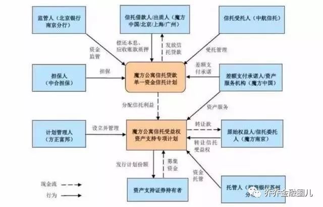 在该交易的排名前列层结构中,魔方南京将3.5亿资金委托给中航信托,设立魔方公寓信托贷款单一资金信托计划。中航信托向魔方公寓发放3.5亿的信托贷款,魔方公寓以运营管理的北京、上海、广州经营的30处物业的4014间公寓未来三年的租金应收账款质押给魔方公寓信托,并以上述公寓的租金及其他收入作为信托贷款的还款来源。