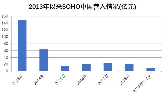 据Wind,SOHO中国转型前曾在2012年拿下了近106亿元净利润,但此后便开始走下坡路。总营收则更是走出了一条下降曲线。2013~2018年,SOHO中国的总营收分别是149.24亿元、63.60亿元、14.04亿元、19.62亿元、22.82亿元、20.89亿元,其中2015年的同比降幅达到了77.93%,近8成。