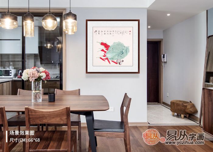 3、挂画大小和数量:餐厅的面积一般不大,挂画的尺寸也大都以四尺斗方(60×60cm)和四尺 (65*130cm)为宜,以免喧宾夺主。