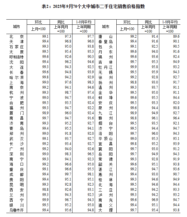2025年9月份,70个大中城市中,各线城市商品住宅销售价格环比下降,同比降幅继续呈收窄态势。