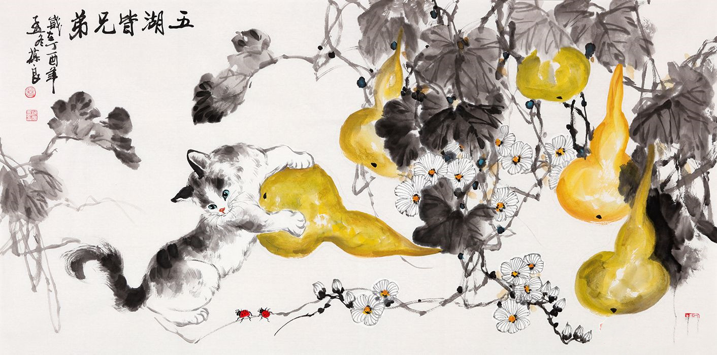 晋葆良老师的这幅《五湖皆兄弟》中,所得到的格调便是对葫芦和猫比拟关系的成立,猫在葫芦中玩耍,融入性很强,富有童趣,更富有哲理性,在观者心中所形成的欢乐场景,于此都显得十分有趣,十分融洽,笔法纯熟,画面合理,完全是一幅怡然自得的自然场景,令人十分的愉悦。而且落款五湖皆兄弟又点名了企业的核心就是相互合作,达到共赢。