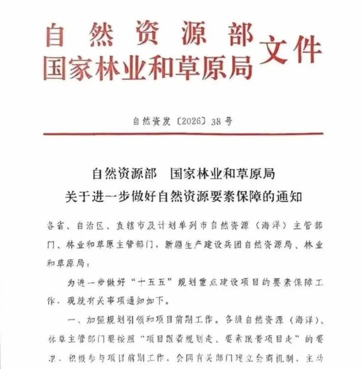 3月5日,两会开幕当天,自然资源部、国家林业和草原局联合发布了一份重磅文件——《关于进一步做好自然资源要素保障的通知》(自然资发〔2026〕38号)。