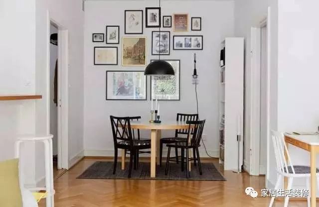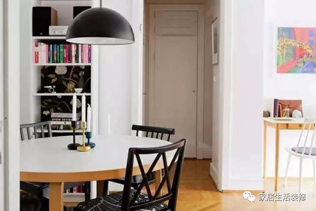 客厅旁边的餐桌,因为业主是做艺术的,所以靠墙体挂了一些自己喜欢的装饰画,具有艺术本身的美感,白色餐桌搭配了黑色的椅子和黑色餐桌底盘布,自然美观营造了一个家庭温馨的氛围。