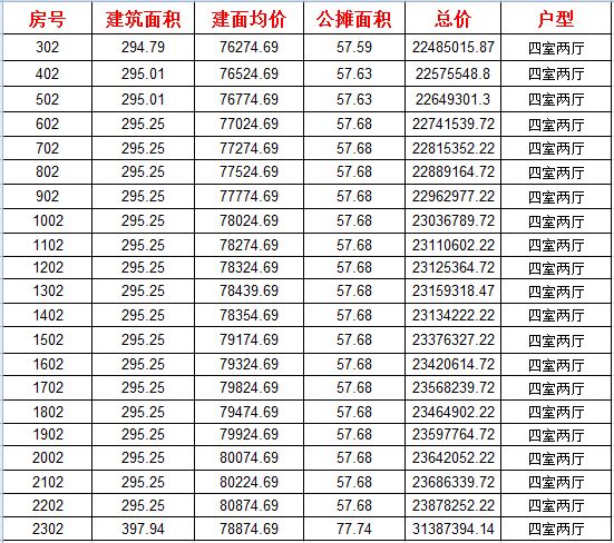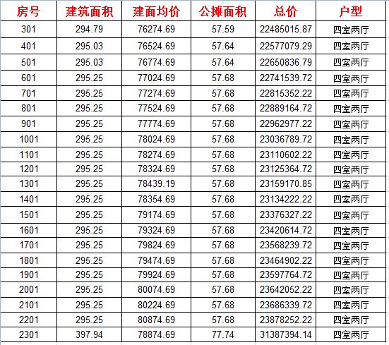 本次开盘的是3#楼,推出3层—23层共42套房源。所推房源全部是四室两厅的大户型,包括294.79平、295.03平、295.25平和397.94平四种。在顶层(23层)是两套397.94平的超大户型。