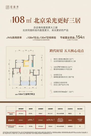 招商序约108㎡“采光大师”,三开间朝南,南向采光面阔达约10.8米,是北京同面积段产品中南向面宽的王者;在亦庄,同等尺度的采光面宽,仅见于其它项目约133㎡的产品中。