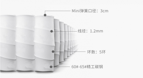 该款床垫内部采用了独特的Mini弹簧,小而精密,弹性十足的特点使整张床垫内弹簧排列非常密集,几乎没有空隙,使身体的每一个点都有弹簧支撑。Mini弹簧对压力的感知力更敏锐,能够自动适应身体各部位的压力,有效的实现了“动态分区”功能,更加适合儿童好动的睡眠习惯。