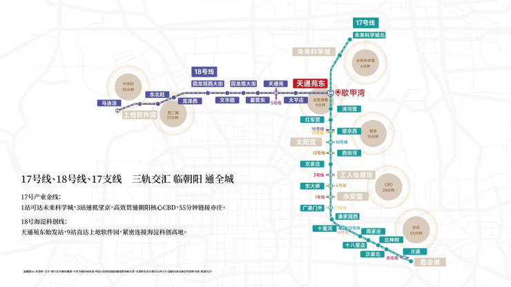 立体交通,临朝阳、通全城。地铁17/18/R6(规划中)号线三轨交汇;两横四纵路网,高效通达望京、西二旗及主城核心区。自然生态,外拥约30.4平方公里温榆河公园,内享约10万㎡歇甲湾公园,搭配项目内部南北双水景,形成双湖环绕的生态居住环境。