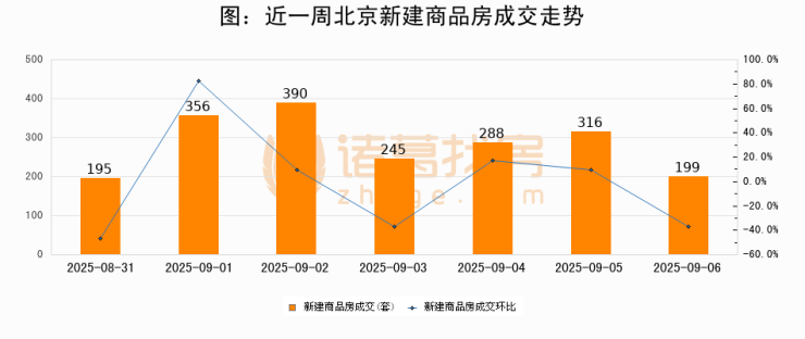 根据北京市住房和城乡建设委员会数据显示,2025年09月06日北京新建商品房成交199套,较昨日减少117套,环比下降37%。近一周北京新建商品房日均成交285套。09月06日单日成交199套,低于近一周平均水平30.2%。