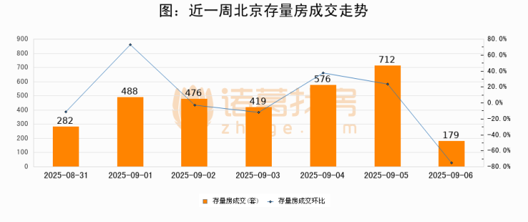 从存量房来看,2025年09月06日北京存量房单日成交179套,比昨日减少533套,环比下降74.9%。从近一周存量房成交来看,北京存量房日均成交套数为447套,09月06日单日成交179套,低于近一周平均水平60%。