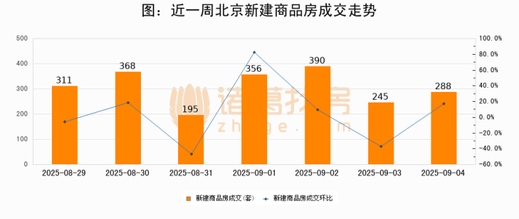 根据北京市住房和城乡建设委员会数据显示,2025年09月04日北京新建商品房成交288套,较昨日增加43套,环比上涨17.5%。近一周北京新建商品房日均成交308套。09月04日单日成交288套,低于近一周平均水平6.5%。