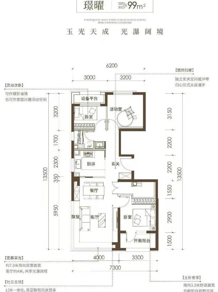 1 在四居的前提下保有南向三面宽的户型格局,并且客厅有约3.9米的面宽;