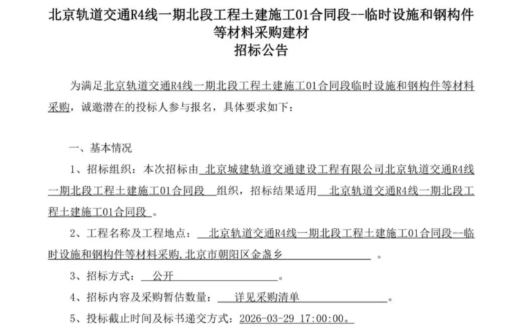 从“总体统筹”到“分项落实”,从“软性风控”到“技术细节”,三项招标合计暂估金额约441.2万元,勾勒出一条清晰的建设逻辑链:全线安全管控体系已先行搭建框架,明挖、矿山、盾构三大核心工法的安全保障方案也已同步配套就位。与此同时,更具实质意义的土建施工01合同段,也已由承建方北京城建轨道交通建设工程有限公司启动了临时设施建设及钢构件等核心材料的采购工作。从管理框架到技术细节,从风控方案到硬核物资,多维度并行的闭环推进,清晰地表明R4线一期北段已从规划论证全面转向现场实施筹备,开工前的一切铺垫正有条不紊地收口。