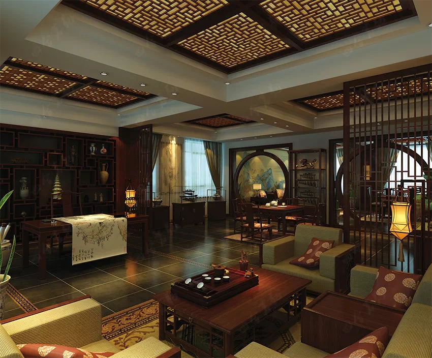 木制的沉着与稳重符合会议室的氛围打造,但以木为主,却也不能忽略空间装饰的层次感。为了避免生硬,窗格样式的吊顶再佐以山水壁挂画的点缀,使得空间中艺术与唯美得到进一步的升华。