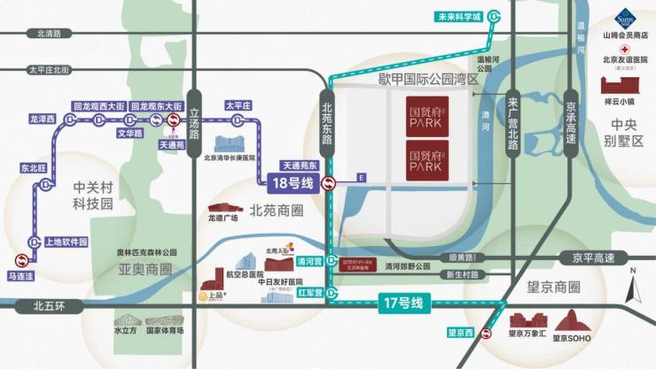 项目西侧约700 米直达地铁17、18、R6号线(规划中)交汇站。17 号线3站速达望京,18 号线直连海淀科创圈,形成黄金十字轨道格局,高效承接朝阳、海淀高净值人群,价值底盘坚实稳固。