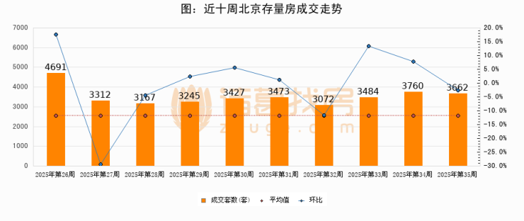 存量房方面,第35周北京存量房成交3662套,较上周减少98套,环比下降2.6%。从近十周成交走势来看,周均成交套数为3529套,本周高于平均水平3.8%。