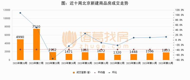 进入2025年第35周(08月25日-08月31日),北京新建商品房成交1803套,较上周增加207套,环比上涨13%。从近十周成交来看,周均成交套数为2560套,本周成交1803套,低于近十周平均成交量29.6%。