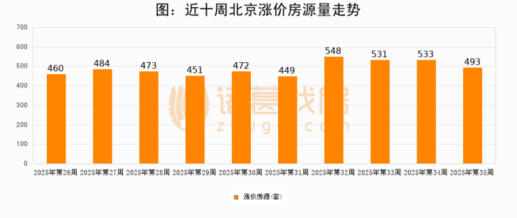 从调价房源来看,第35周北京涨价房源493套,较上周下降7.5%。与此同时,35周涨价房源占比回落0.48个百分点,业主信心小幅波动,购房者可则需入市。