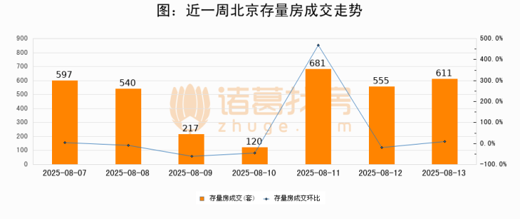 从存量房来看,2025年08月13日北京存量房单日成交611套,比昨日增加56套,环比上涨10.1%。从近一周存量房成交来看,北京存量房日均成交套数为474套,08月13日单日成交611套,高于近一周平均水平28.9%。