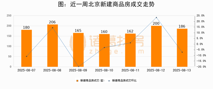 根据北京市住房和城乡建设委员会数据显示,2025年08月13日北京新建商品房成交186套,较昨日减少14套,环比下降7%。近一周北京新建商品房日均成交180套。08月13日单日成交186套,高于近一周平均水平3.3%。